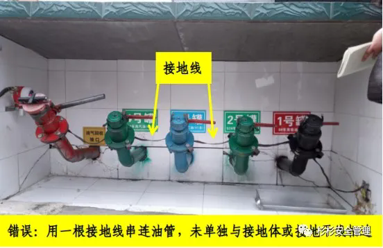 下面就是錯(cuò)誤的做法,用一根接地線串連油管,沒(méi)有單獨(dú)與接地體或接地干線相連。(來(lái)源:微信公眾號(hào):杉杉安全管理,網(wǎng)址:卸油口的管理要求)