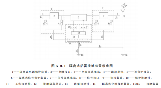 隔離式防雷接地裝置可包含隔離式電源保護(hù)裝置、隔離式信號(hào)保護(hù)裝置、隔離式分組接地裝置。隔離式電源保護(hù)裝置應(yīng)串接在電源端口;隔離式信號(hào)保護(hù)裝置應(yīng)串接在信號(hào)端口;隔離式分組接地裝置應(yīng)串接在接地干線和接地體之間。
